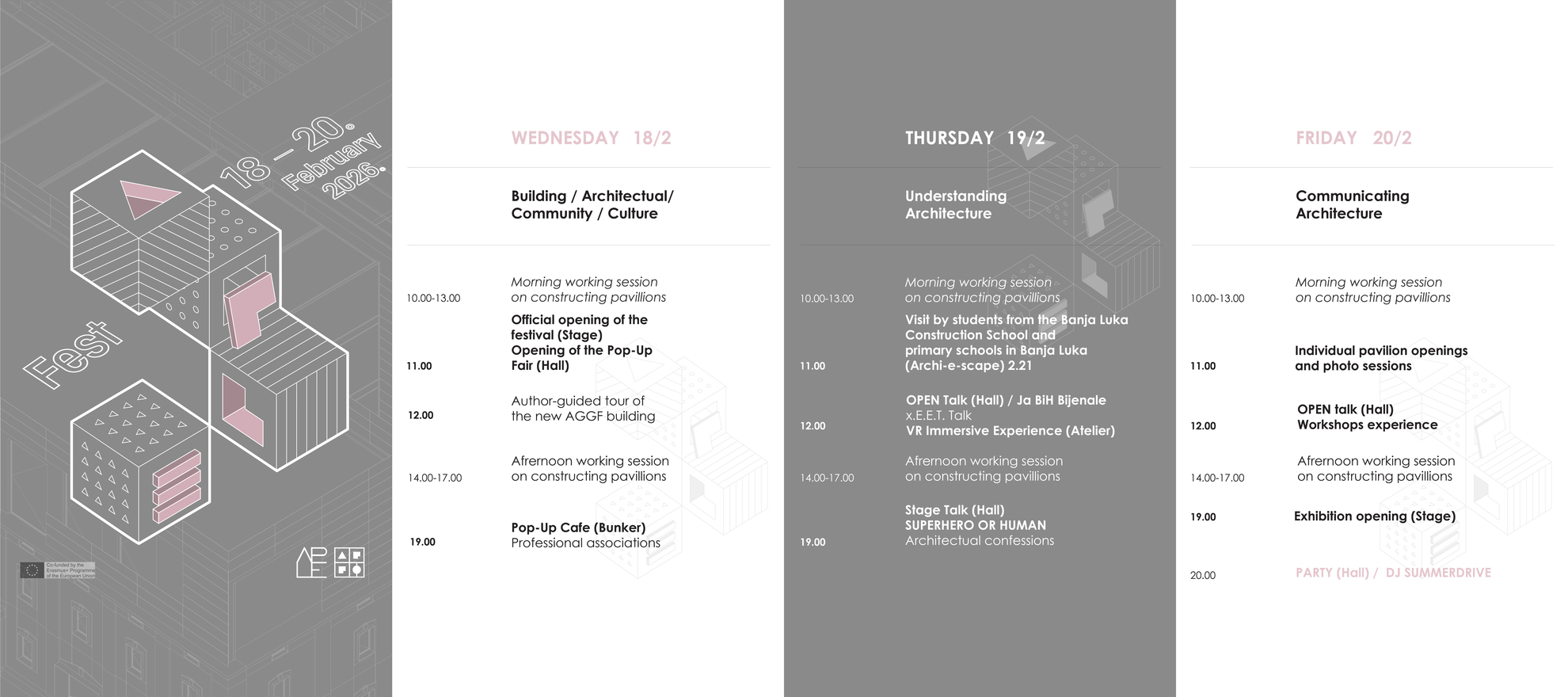 APLE Fest transformiše novu zgradu AGGF-a u otvorenu kuću arhitekture u kojoj se kroz izložbe, razgovore, prezentacije i radionice predstavljaju inovativni modeli učenja kroz rad, razvijeni u okviru Erazmus+ APLE projekta. APLE Fest simulira Pop-Up Live Studio – u kojem, na izgradnji pet arhitektonskih paviljona, učestvuje 30 studenata i nastavnika sa sedam arhitektonskih fakulteta (iz Trondhajma, Rima, Zagreba, Podgorice, Mostara, Sarajeva i Banje Luke); Pop-Up Fair, sa partnerima iz privrede; Pop-Up Cafe sa temom građenja zajednice arhitekata; OPEN Talks i STAGE Talks, koji tematizuju razumijevanje i komunikaciju arhitekture; te stručna vođenja, posjete i radionice (Archi-e-scape, VR) sa učenicima srednjih i osnovnih škola.