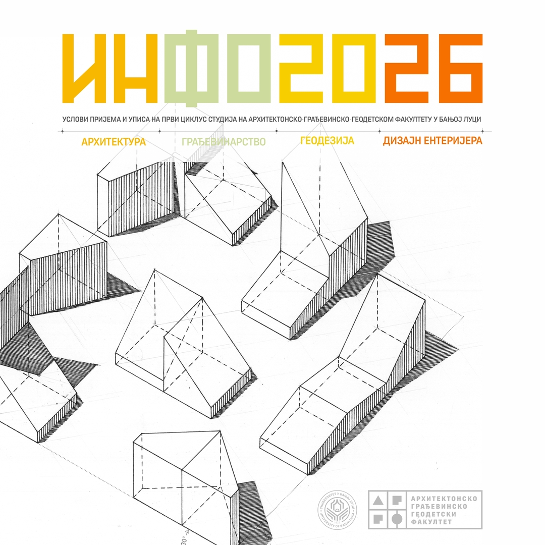 АктуелностиНовости и обавјештењаУПИС 2026/2027Све потребне информације о пријемном испиту, условима пријема кандидата, уписа и студирања на Архитектонско-грађевинско-геодетском факултету, Универзитета у Бањој Луци, као и примјере задатака са рјешењима можете пронаћи у Информатору за школску 2026/2027 годину.